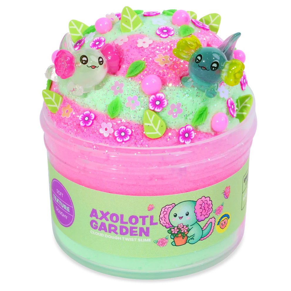 Cloud Dough Twist Slime with a soft, doughy texture and rose fizz scent. Comes complete with axolotl and garden themed charms, mix-ins and sprinkles. 7oz