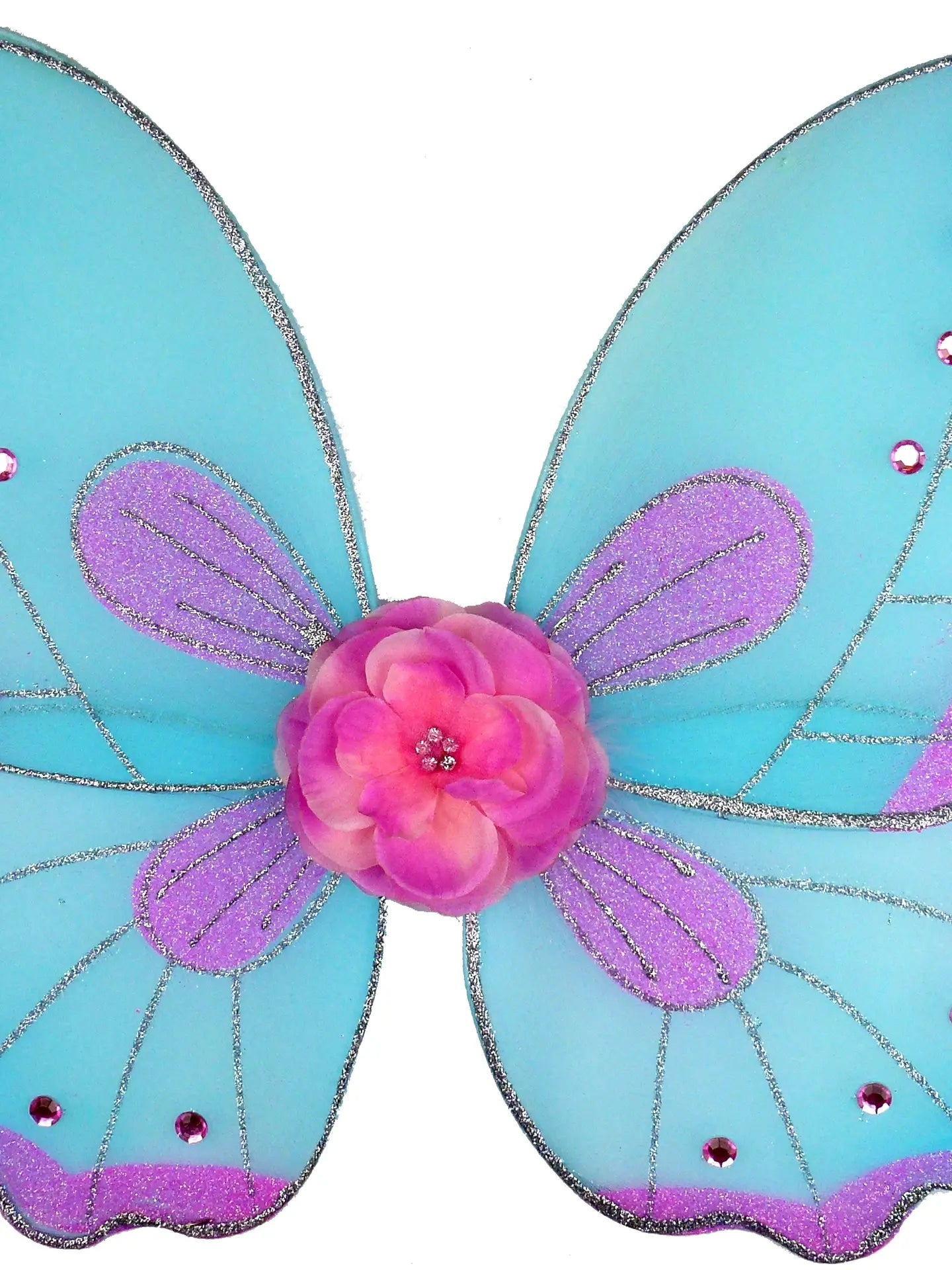 Our Princess wings pair perfectly with a fairy dress or skirt for fairy dress-up play! Shimmery color with glitter and rhinestone accents for sparkly fun. Worn like a backpack with stretchy elastic straps, our wings are comfy to wear. Hand-decorated with fabric flowers and sparkly details! Each one is unique and flowers may vary. Nylon frames measure approx. 21 x 15".