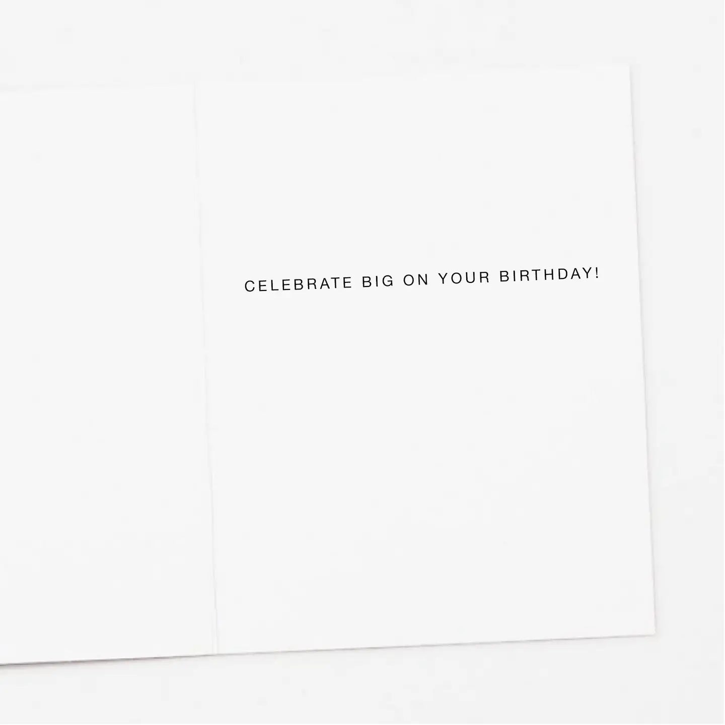 Inside greeting: "CELEBRATE BIG ON YOUR BIRTHDAY!" Printed on premium recycled paper. Paired with recycled brown kraft envelopes. Packaged in cello.