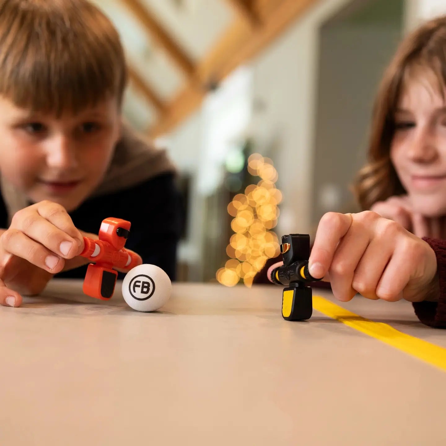 Roll out one of the silicone goal lines onto your side of the table, then grab your Foosbot. When you squeeze its arms, it spins to kick the ball FAST. Can you get the ball past your opponent's goal while letting nothing past yours? With intense, fast-paced gameplay, portable design, and more Foosbots to collect, the thrill never stops! Foosbots 2-pack Set of 2 Foosbots with silicone goal lines and a ball Encourages hand-eye coordination, fast reflexes, creativity Squeeze the arms of the Foosbot to make it spin and kick the ball Goal lines lay flat and stay in place on any smooth surface Includes 2 Foosbots, 2 silicone goal lines, ball Packaged in a sturdy, snap-shut storage case Foosbots each measure about 2.75 x 2.5 x 0.75 inches Collect all the Foosbots! - Each has a unique design and colors High-quality materials and construction - Exceptional gameplay Ages 6+
