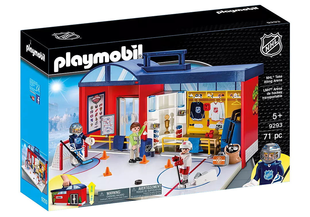 Figures: 2 hockey players, 1 referee; accessories: 1 take-away arena, 1 scoreboard, 2 dumbbells, 2 bags, 1 can, 2 towels, 4 pucks, 2 hockey sticks, 2 barriers, 2 drinks, 6 bottles, 1 arm guard, 1 glove, 1 helmet, 2 knee pads, 1 whistle, 1 first aid kit, 1 bench, 1 sack, 2 pylons, 1 winner's trophy, 1 corner shelf, 1 changing room shelf, 1 goal net, 1 strategy board, 1 shooting aid