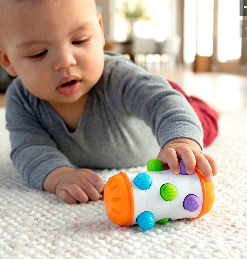 - Encourages sensory learning, fine motor skills, cause-effect learning