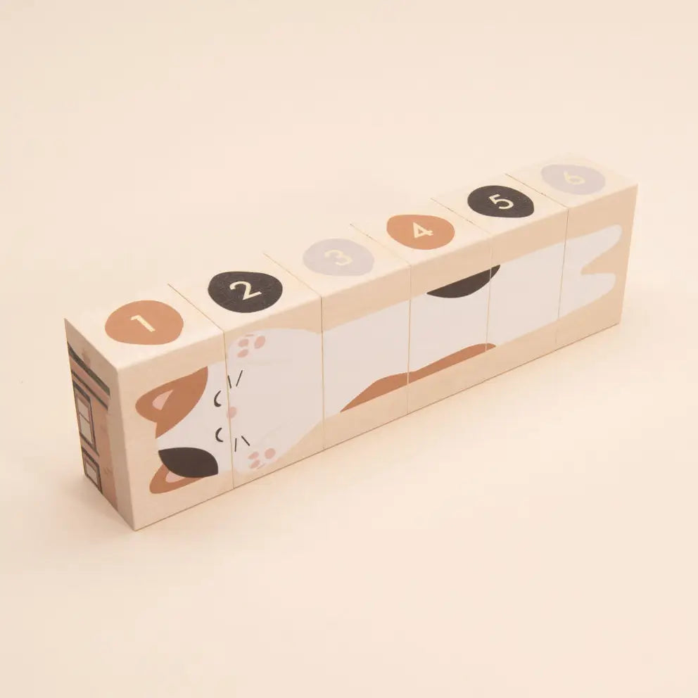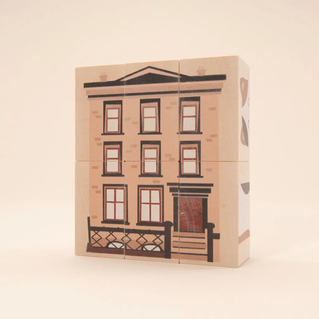 Be the architect of endless stories! These 6 wooden blocks are your ticket to big-city adventures. Stack the blocks to build a brownstone. Flip them around to display four cheese-loving mice and a curious calico cat. Will the cat catch the mice? Or will they outsmart their feline neighbor? Build, imagine, and explore!